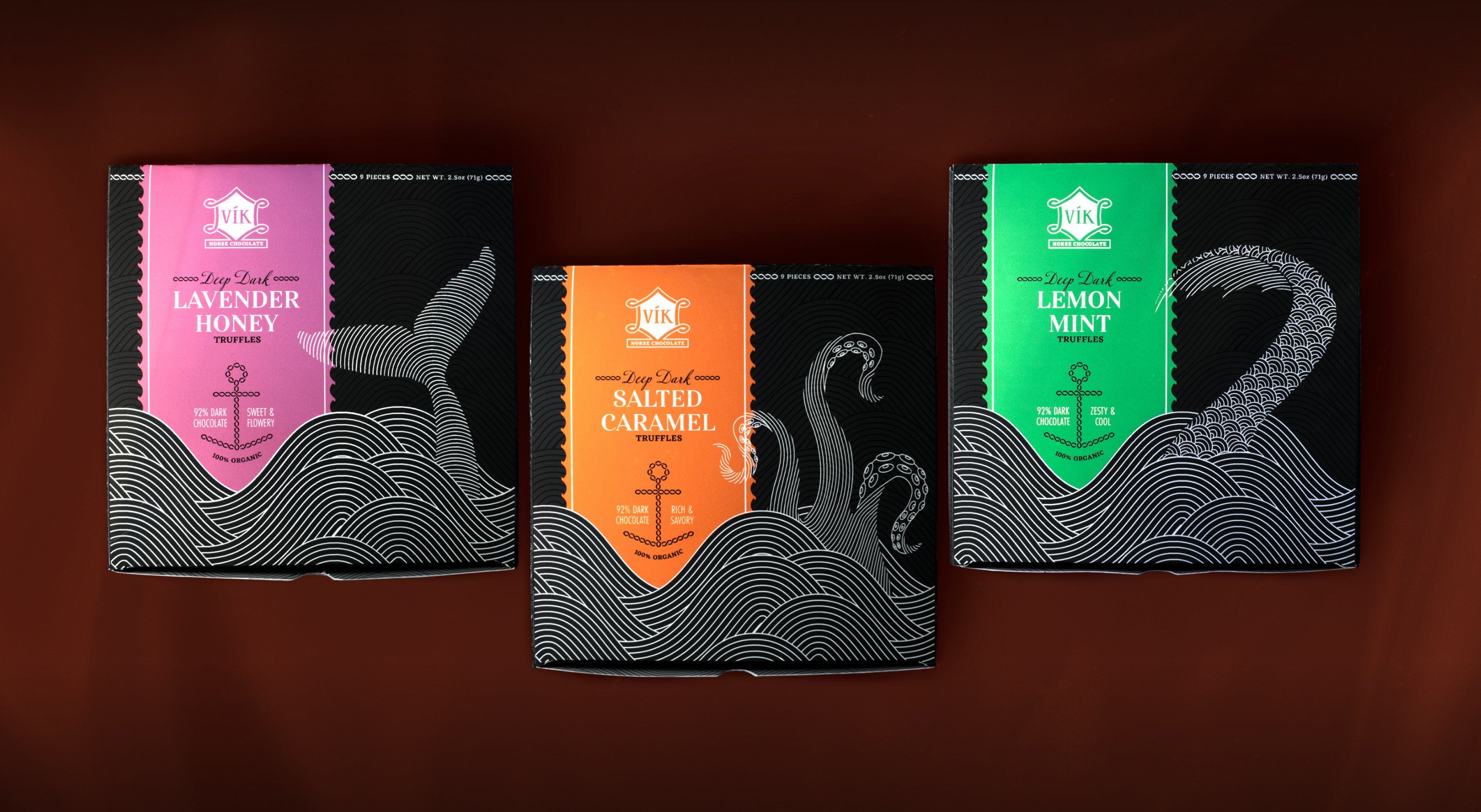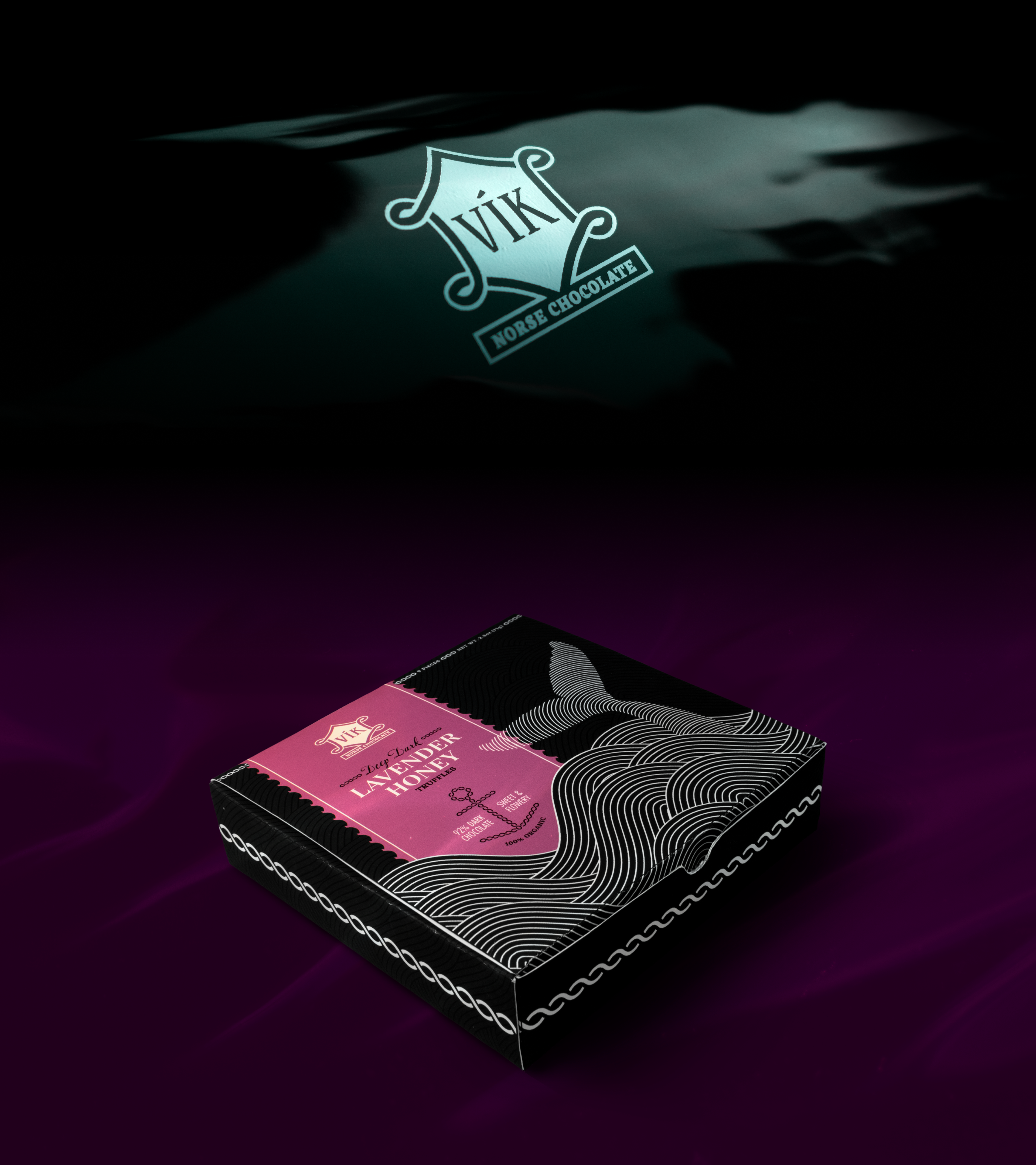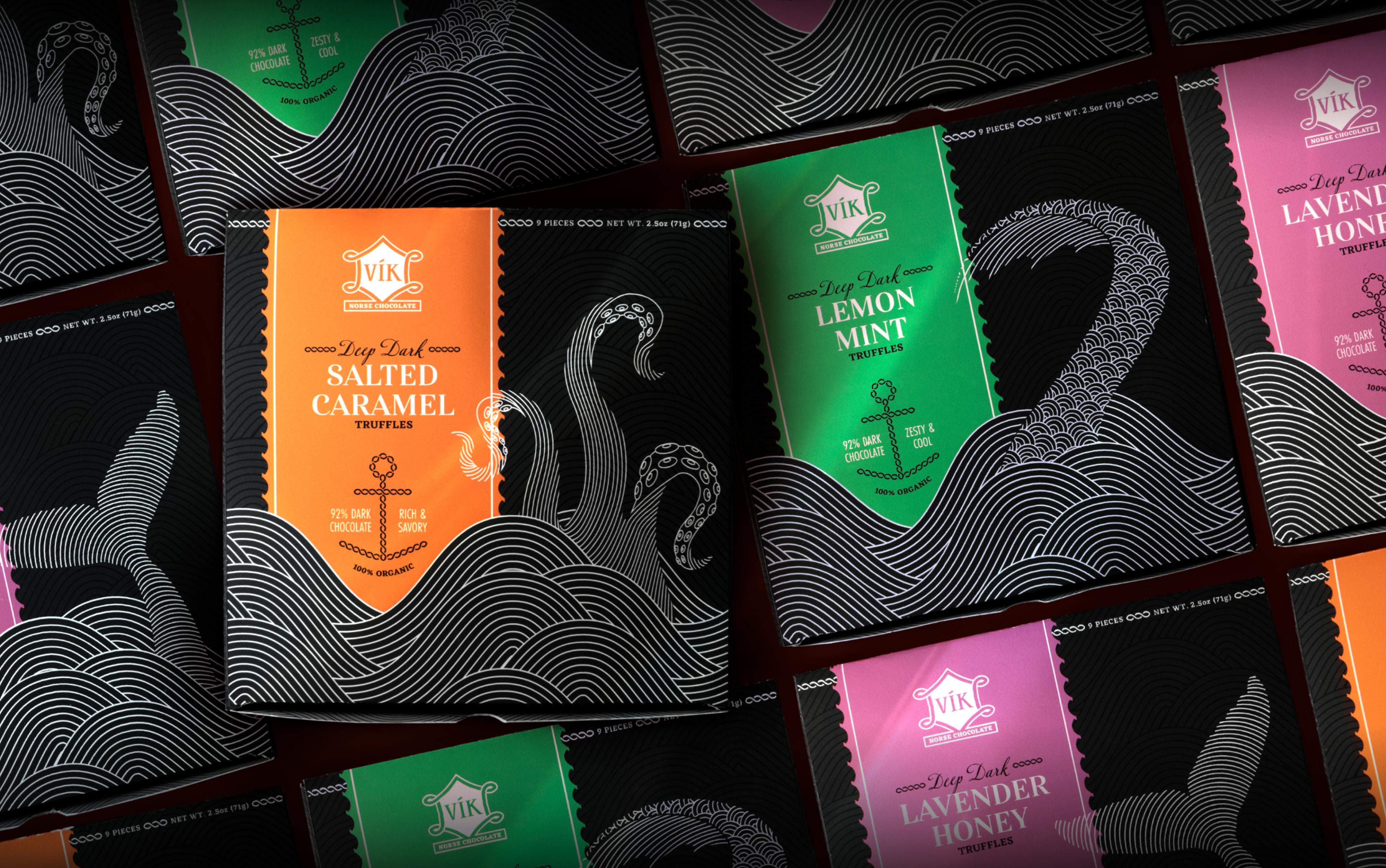 Set sail on a visual exploration inspired by ancient legends of the Norse seas. This ominous, luxurious packaging for dark chocolate truffles brings to life three colossal Norse sea monsters, reimagined in a rhythmic, modern design concept.