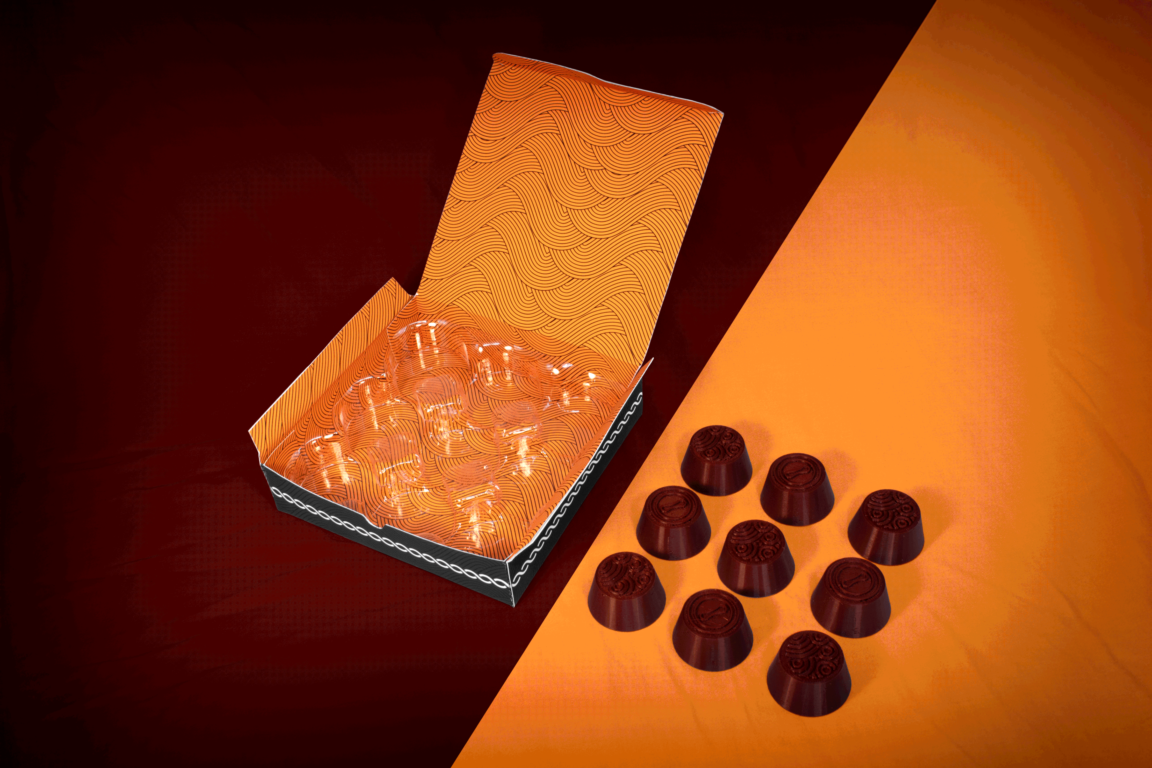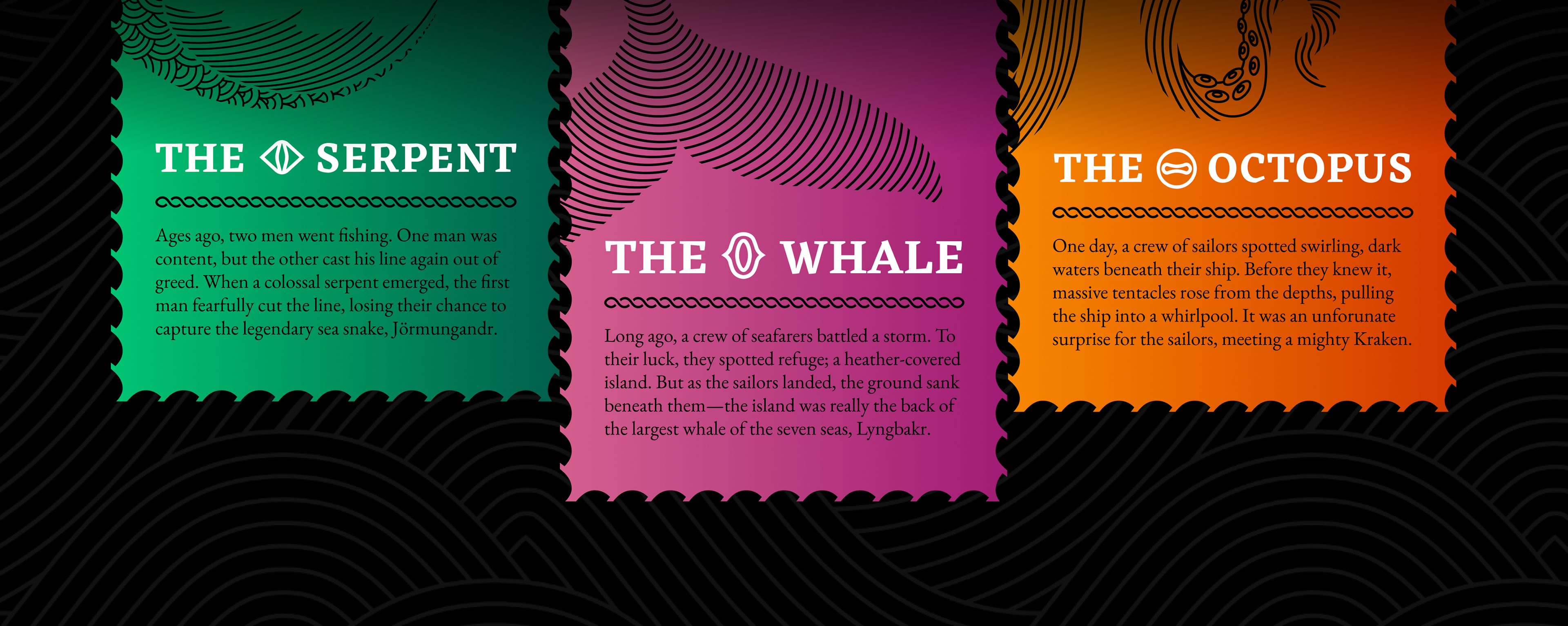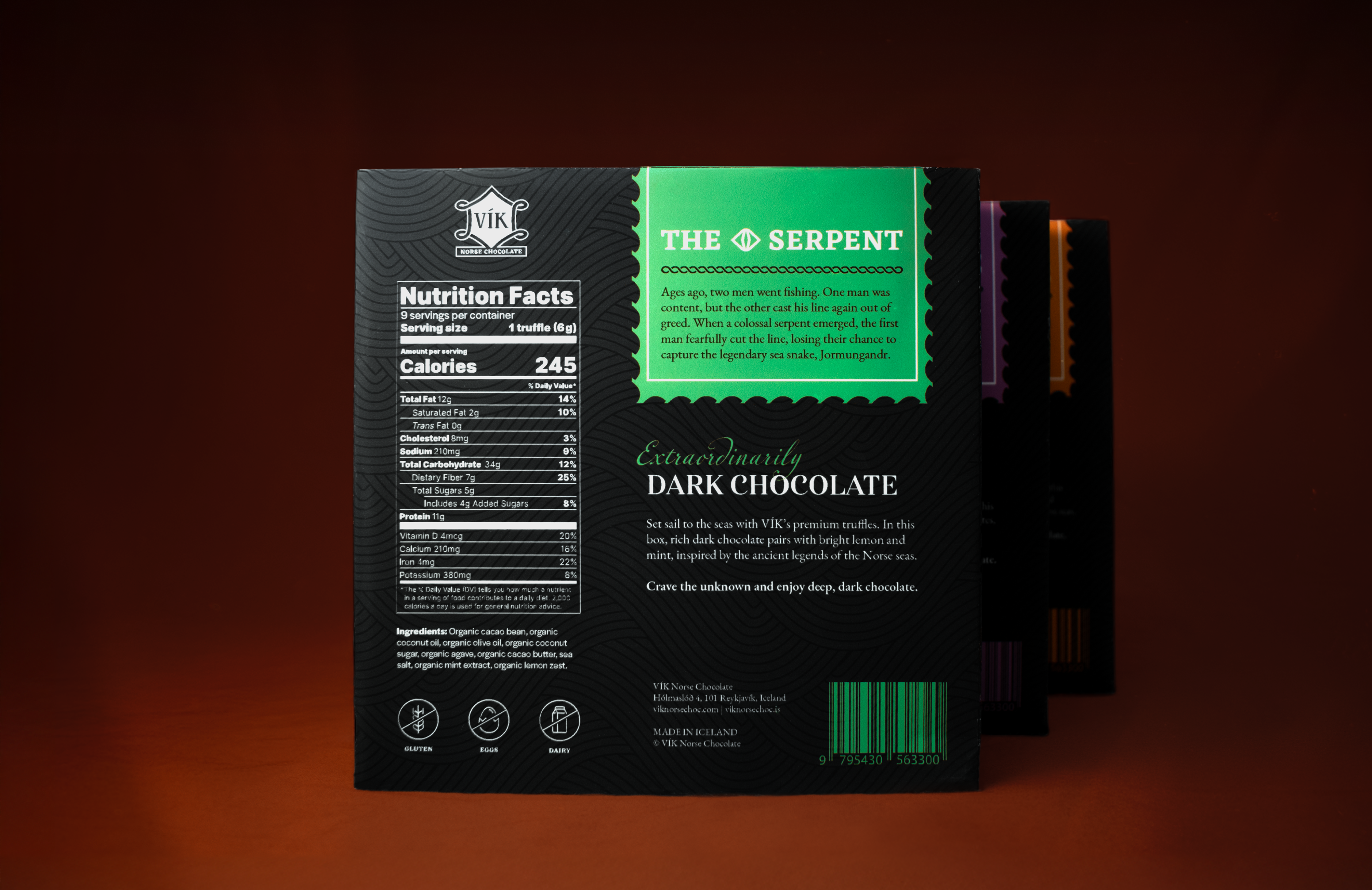 Set sail on a visual exploration inspired by ancient legends of the Norse seas. This ominous, luxurious packaging for dark chocolate truffles brings to life three colossal Norse sea monsters, reimagined in a rhythmic, modern design concept.